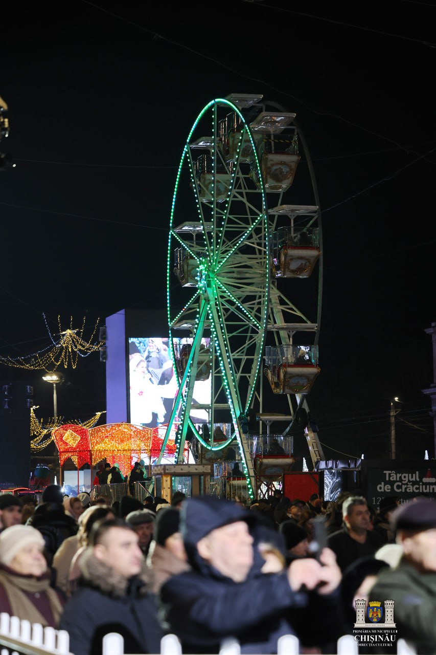 Roata se înalță peste luminile și decorațiunile strălucitoare, oferind vizitatorilor o experiență unică. De la înălțimea sa, cei care se aventurează să se urce pot admira centrul Chișinăului scăldat în lumini colorate.